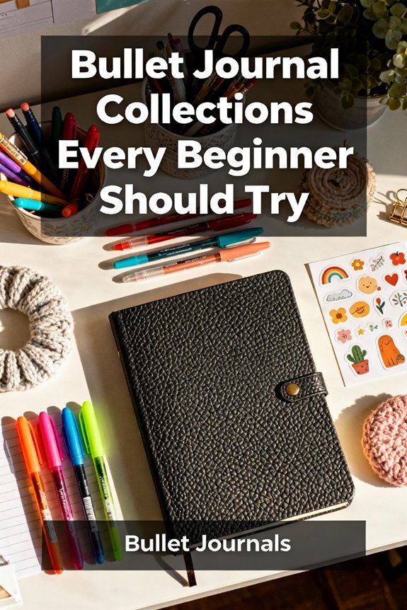 Start your bullet journal with these essential collections: a Future Log to capture long-term plans, a Monthly Log for your calendar view, and a Daily Log where you'll track everything that happens today. Add a Habit Tracker to build consistency, a Brain Dump page to clear mental clutter, and a Books to Read list so recommendations don't slip away. Include a Budget Tracker for financial awareness and a Master Task List to catch everything requiring action. These foundational spreads change scattered thoughts into organized systems that actually work, and understanding how to customize each one will reveal their full potential.