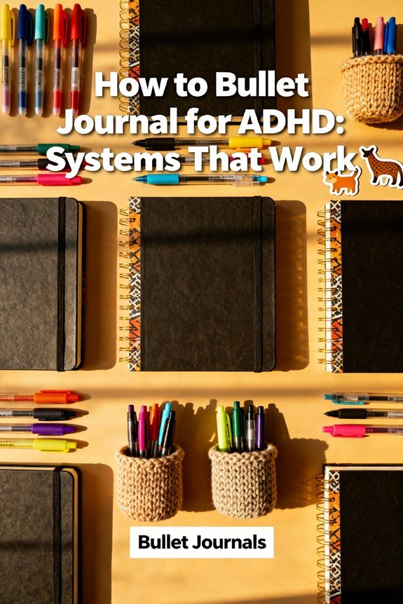 Start with just a notebook, pen, and today's date—nothing more. Skip indexing, complex symbols, and migration systems that traditional bullet journaling demands, as these increase cognitive load for ADHD brains. Instead, limit colors to three functional categories, use hour-by-hour time blocks rather than open logs, and build in 5-15 minute change periods between tasks. Your journal should provide immediate visual feedback with minimal steps, not perfect spreads. The key lies in designing a system that works with your executive dysfunction, not against it.
