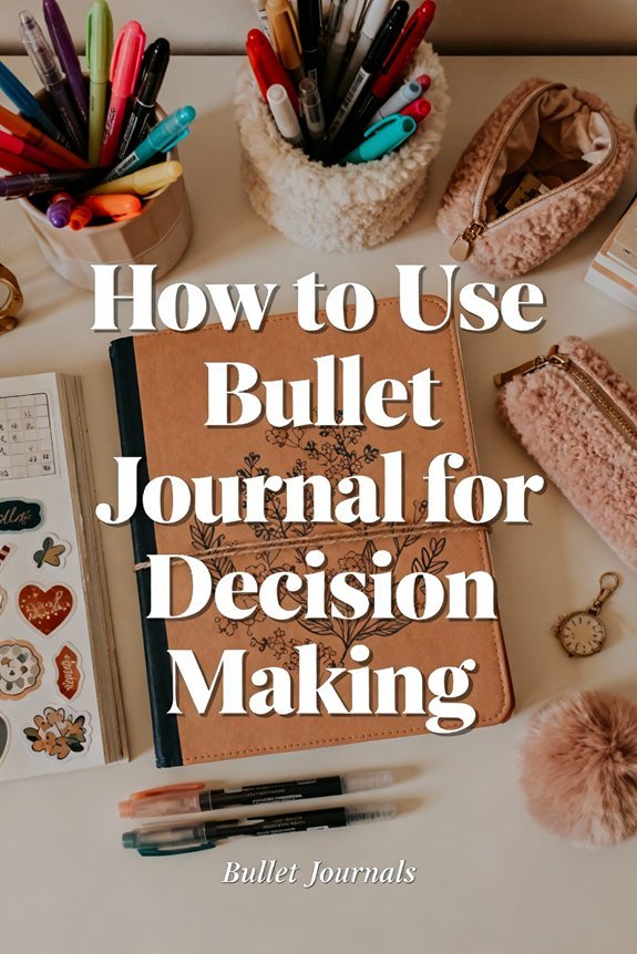 Convert your bullet journal into a decision-making tool by creating structured spreads that externalize your thought process. Start with weighted pros-and-cons lists or decision matrices that assign numerical values to competing factors. Track your predictions against actual outcomes to identify cognitive biases and build pattern recognition over time. Include emotional check-ins and values alignment exercises to guarantee decisions match your priorities. Add color-coding for decision categories and timeline projections to visualize consequences. These systematic approaches reveal insights that intuition alone might miss.