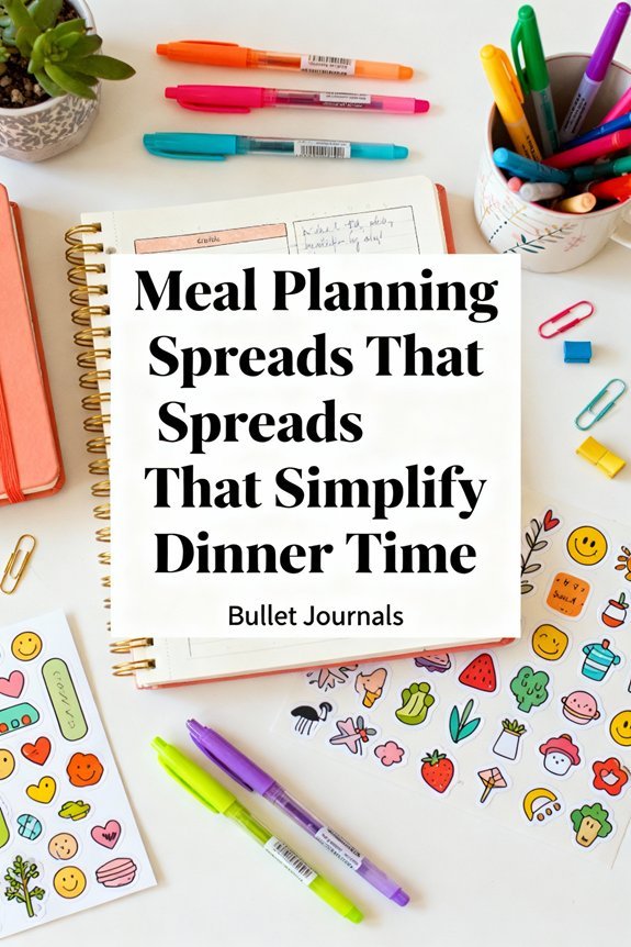 You'll optimize dinner prep by adopting weekly grid spreads that reduce food waste by up to 50% while cutting grocery spending by 20%. Choose minimalist formats with three columns—day, protein, and vegetables—to eliminate decision fatigue, or opt for color-coded family layouts that track individual dietary needs. Include price-per-serving calculations and time-blocking sections to align nutrition goals with your budget and schedule. Pair paper planning for cognitive retention with digital tools for automatic macro tracking. The spreads below reveal how to integrate these elements into a sustainable system.