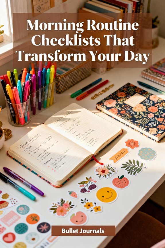 Your life-altering morning checklist starts with three non-negotiable anchors: a consistent wake time, immediate hydration, and nutritious breakfast. You'll then time-block specific activities—whether that's 10 minutes of movement, 5 minutes of mindfulness, or 15 minutes of strategic planning—based on your natural energy patterns. Track your completion rates weekly and adjust what isn't working. This structured approach reduces decision fatigue, triggers motivating dopamine rewards, and activates your prefrontal cortex for peak performance. The frameworks below reveal how to customize these elements for your unique lifestyle and goals.